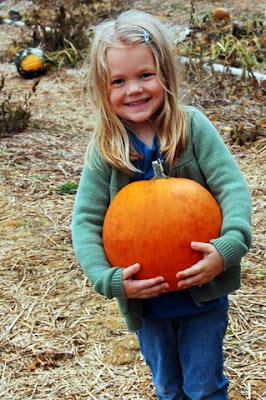(He tried to take this little green one home, but we encouraged him to try a little harder and he ended up with a big orange one too. And by the way, something I didn't think about when we made the "you have to be able to lift it" rule was that the bigger our kids get, the bigger their pumpkins are, and that means more pounds weighing in at the counter. Four big orange pumpkins set us back a pretty penny this year! But they sure were fun to carve!)